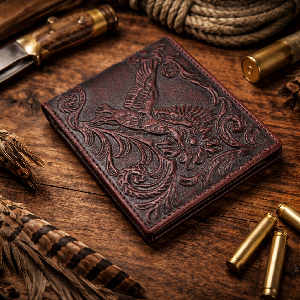 The perfect outdoorsman bifold wallet in mahogany brown genuine leather with hand drawn mallards tooled engraving. Inside leather is stained coffee brown.